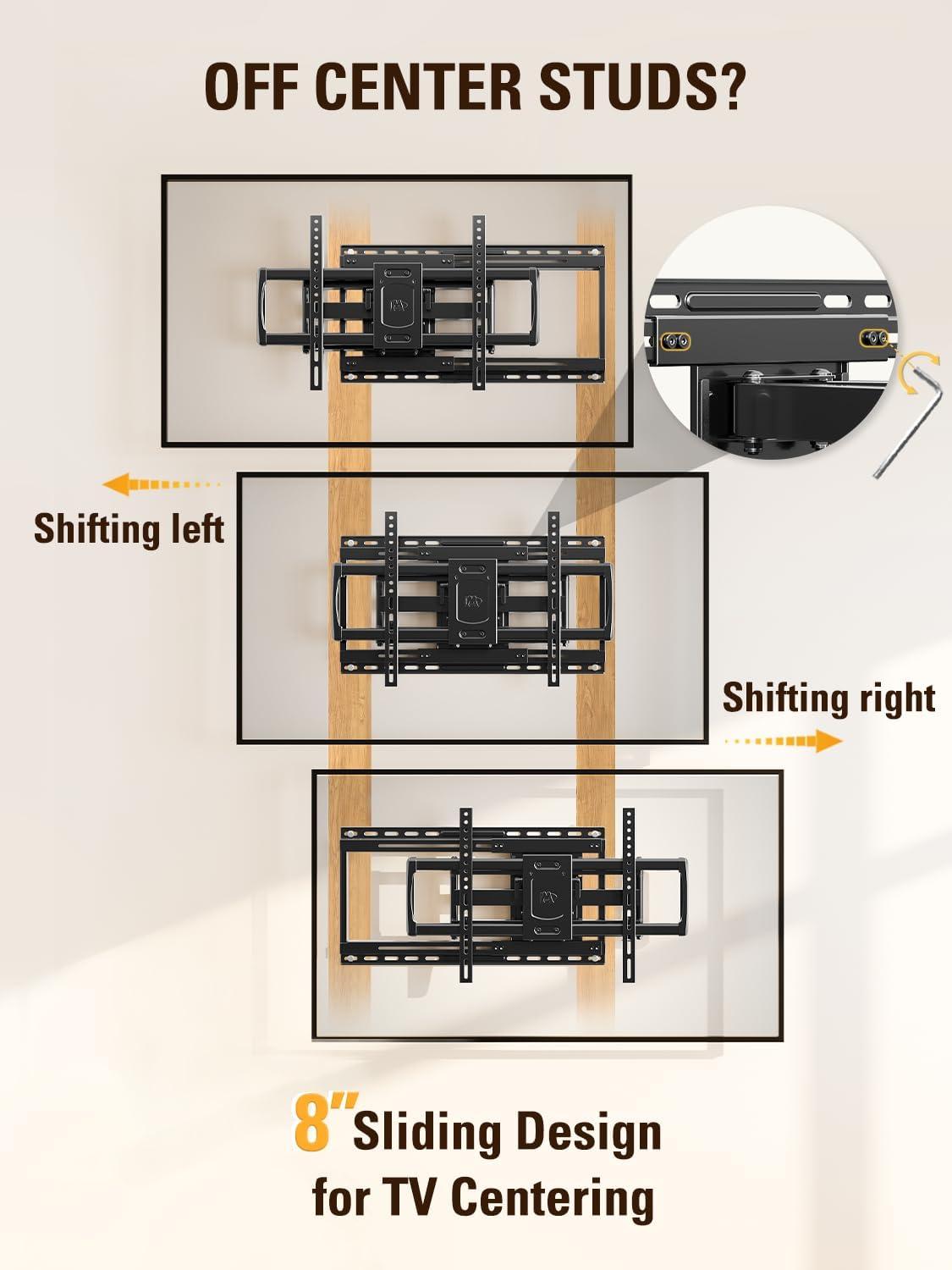 Perfect centered design: Off Center Studs? Full Motion TV Wall Mount with 8″ sliding design allows TV shifting left or right, it is easy for TV centering on the wall plate. All our TV mount can not be installed on drywall alone.