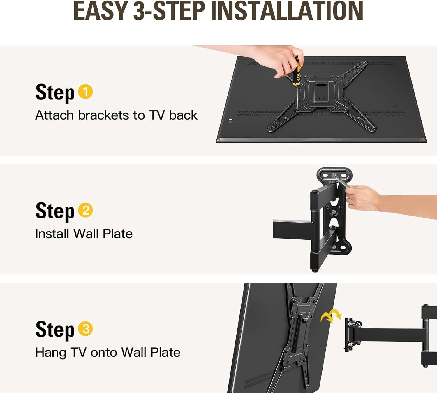 Universal TV Mounting Bracket: TV wall mount fits most 26-55″ TVs up to 60lbs, with VESA ranging from 100×100 to 400x400mm. Articulating TV mount is designed for single wood stud or concrete/brick wall. Please check the TV VESA, TV weight, compatible wall types and possible blocked input before buying.
