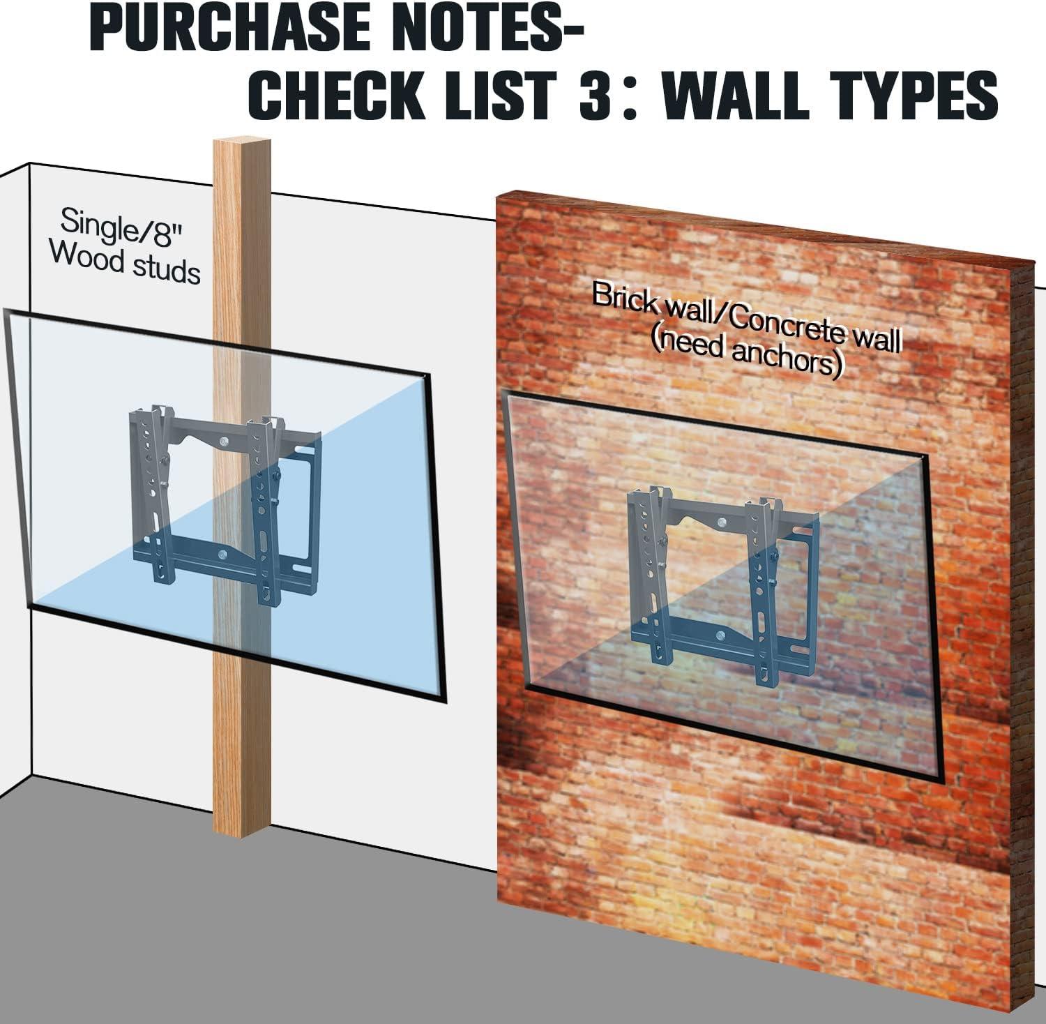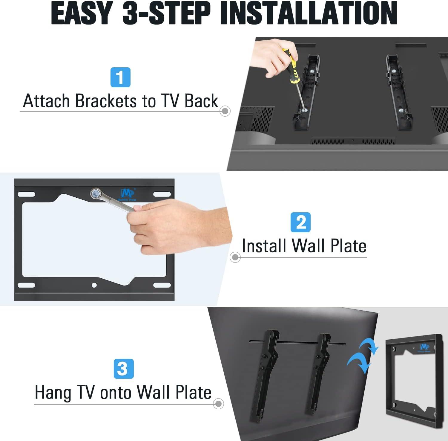EASY INSTALLATION: Only 3 parts (1 Wall plate + 2 brackets) construction easy for assembly and installation, All included hardware in pre-labeled bags. Tv mount bracket Easy install on single stud mounting or 8” wood studs or concrete wall. Concrete Anchors will be sent per request. All our TV bracket are not for dry wall alone installation!