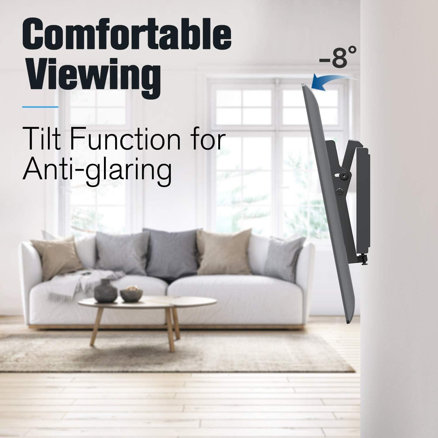 SAVE SPACE AND REDUCE GLARE: Keep your TV close to the wall 1.3” flush profile. Our low profile tilting TV mount saving space with stylish appearance. Tilt your TV forward up to 8 degrees to reduce glare for better viewing.