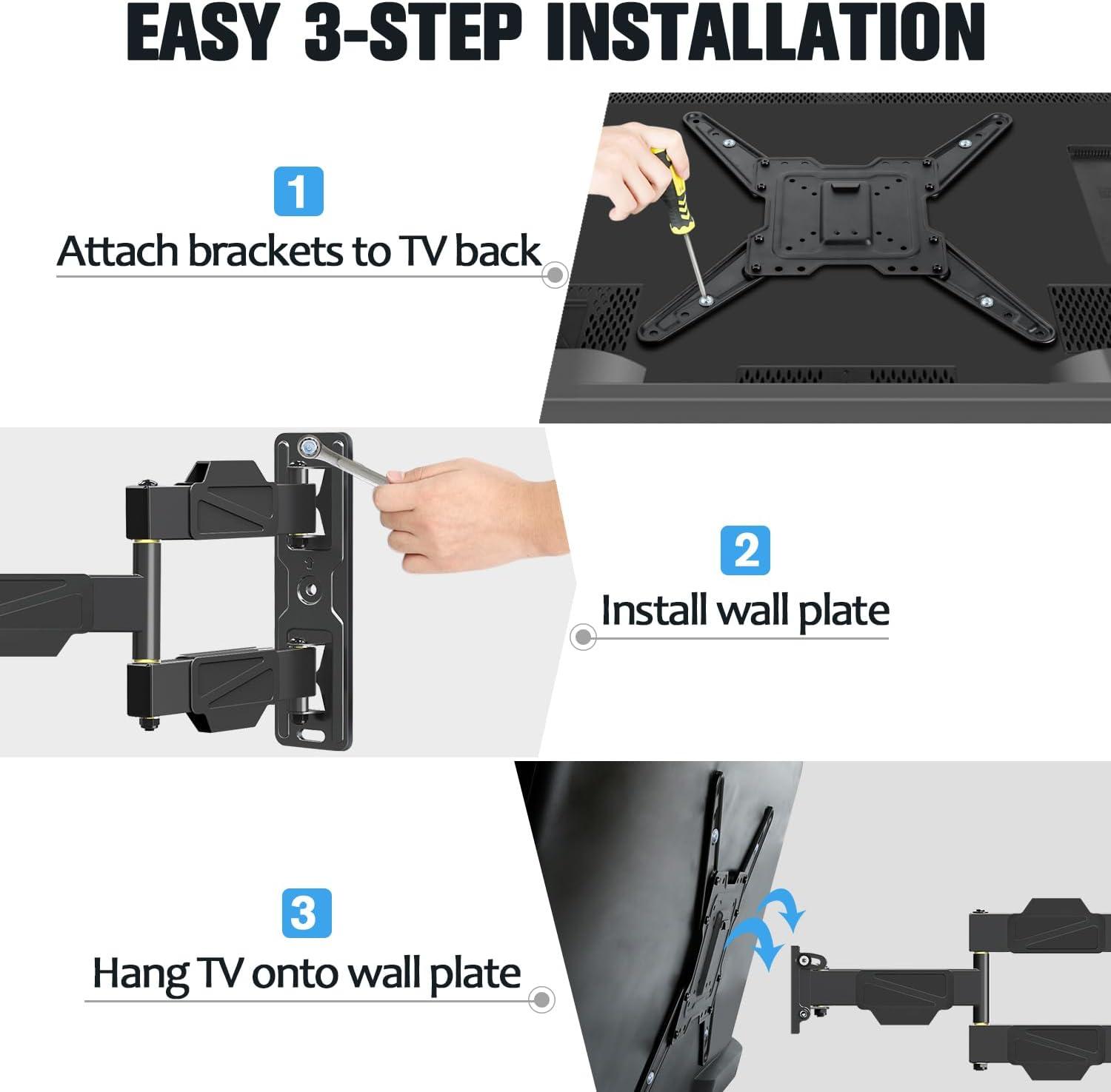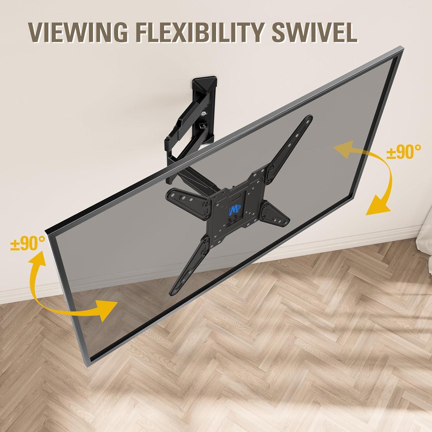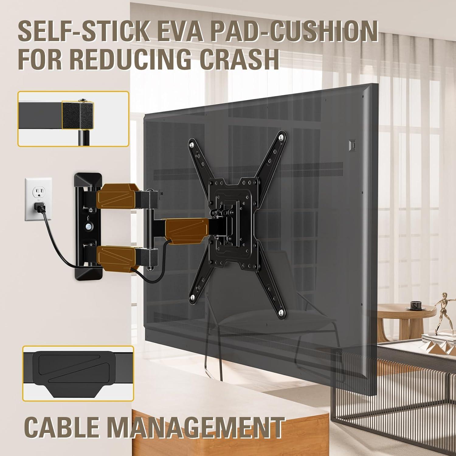 [Corner TV Wall Mount with Cable hider]: Upgraded from previous model MD2413-MX swivel mount, this TV mounting bracket MD2418-MX comes with self-stick EVA pad for the articulating arms to reduce any scratch or crash on TV. Three cable clips will manage any cables behind TV, which makes the viewing environment neat and more comfortable.