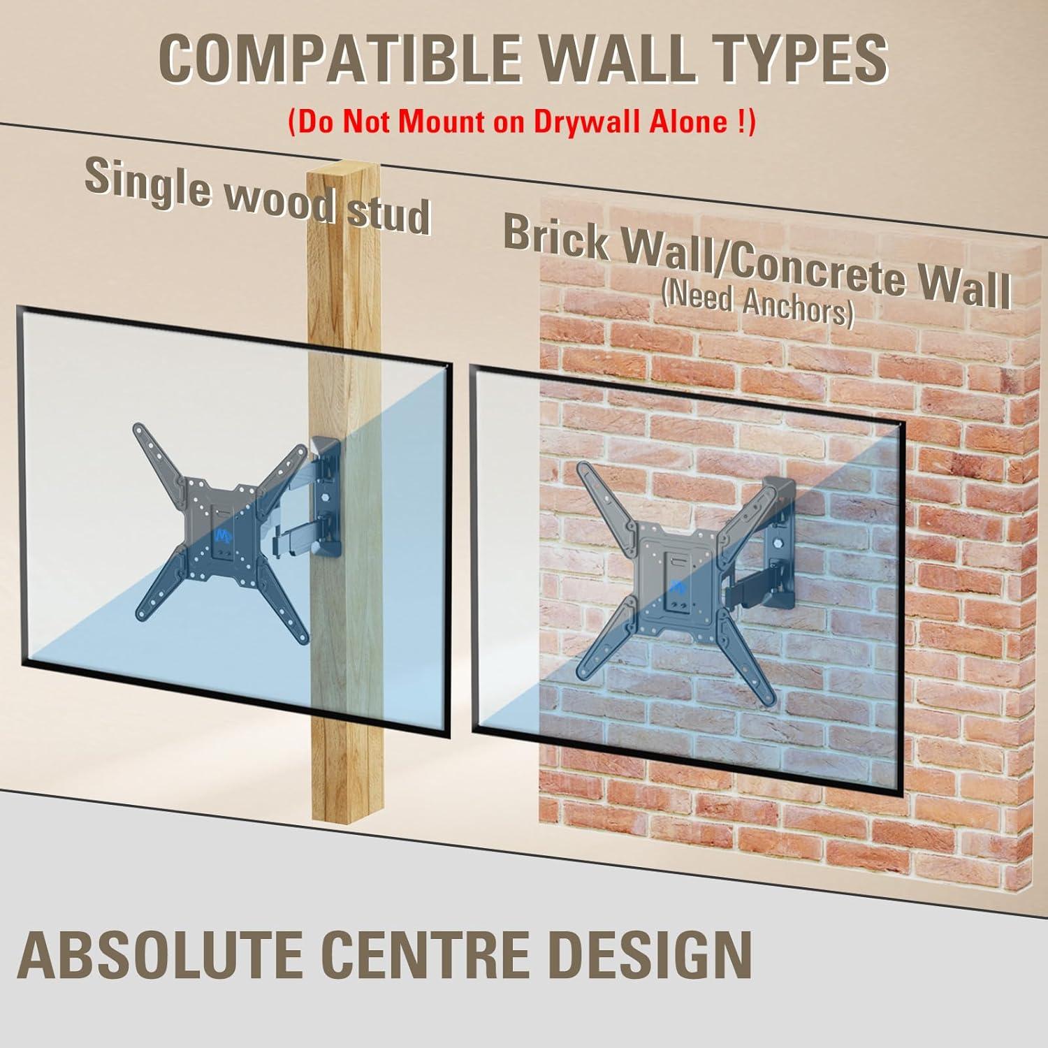 [Universal TV Mounting Bracket]: Versatile TV wall mount fits most 26-55″ LED, LCD, OLED, 4K, flat screen or curved, TVs up to 77lbs, with VESA ranging from 75×75 to 400x400mm. Articulating TV mount is designed for single wood stud, ok for concrete/brick wall as well.