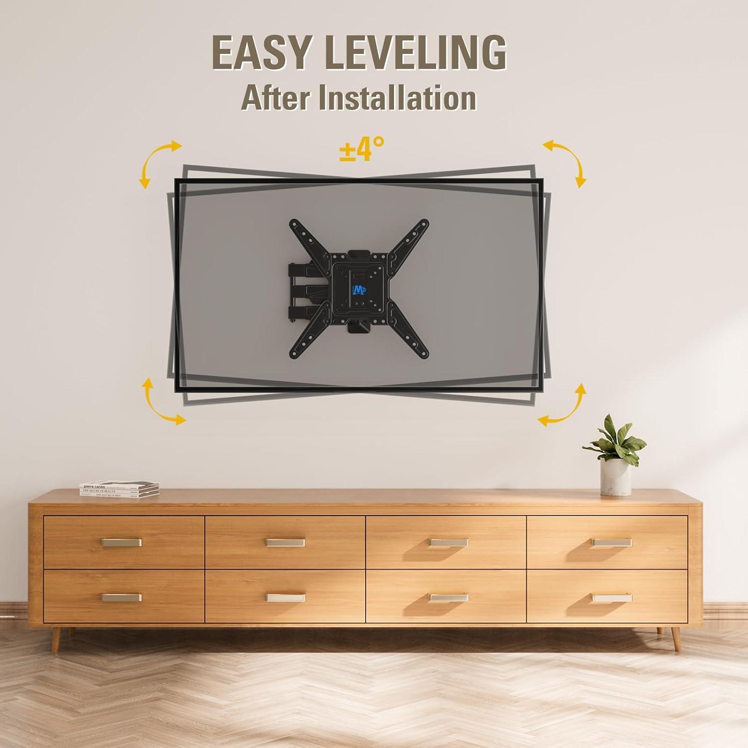 [Long Extension TV Mount with Swivel and Tilt]: This swivel TV mount brackets with articulating arms provides +5°/-15° tilt, +/-90° swivel, +/-4° level, which help reduce glare and optimize your special viewing experience. The adjustable TV wall mount can extend up to 16.7″ and retract back to 2.7″ to save space for a sleek and tidy appearance and pivot TVs left or right.