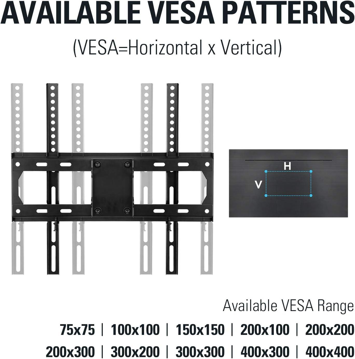 UNIVERSAL DESIGN: TV Mount fits for most 32-65 inch flat screen TV, 99 lbs. Max weight capacity with Max VESA size from 75 x 75mm to 400 x 400mm, compatible with 16″, 18″, 24″ wood studs spacing, plus the concrete wall.